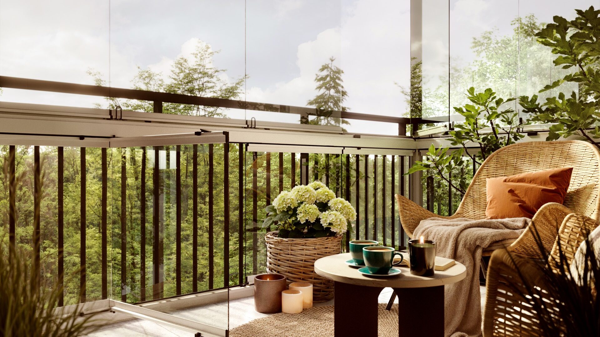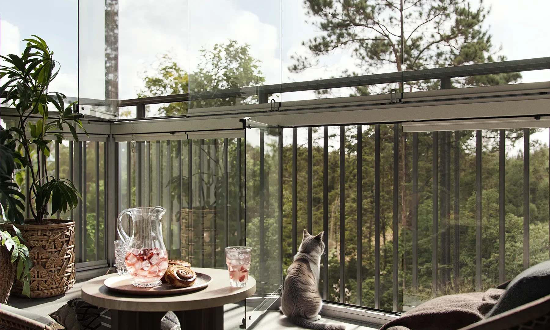 Lösningen behåller den öppna, ljusa känslan från en ramfri inglasning, men adderar en praktisk funktion som gör balkongen ännu mer användbar. Systemet monteras innanför befintligt räcke och kan anpassas efter balkongens mått och förutsättningar – byggt för nordiskt klimat och lång livslängd.