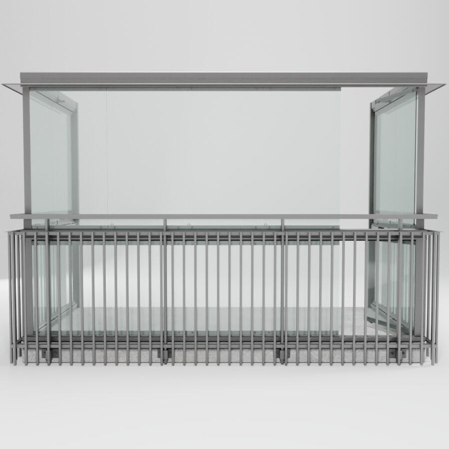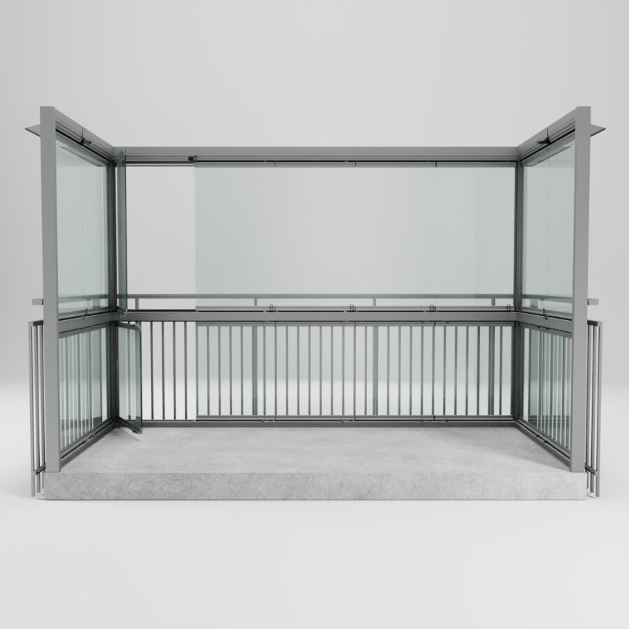 Monteras innanför befintligt balkongräcke. Varje nedre lucka kan öppnas individuellt för vädring och åtkomst. Bygger på Windoor 410-systemet.