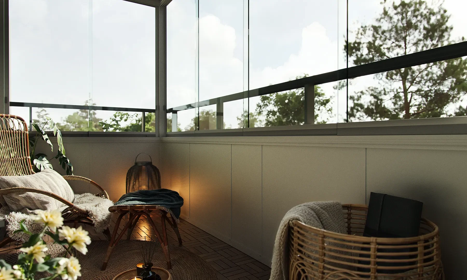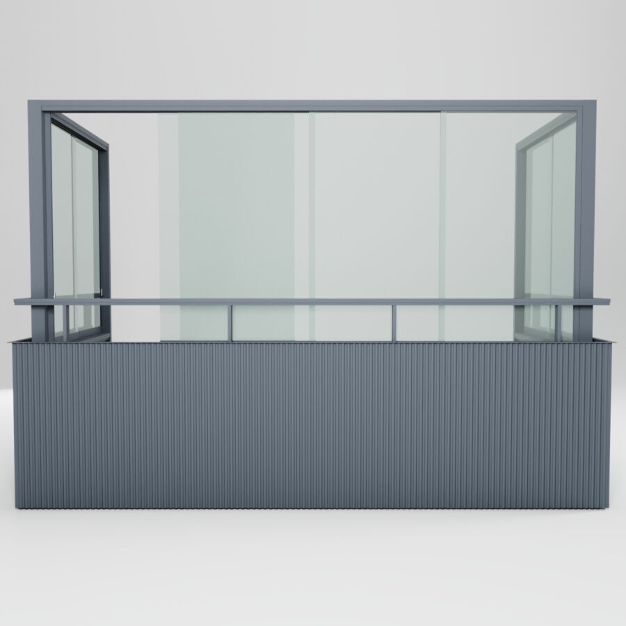 Luckorna löper bakom varandra i ett bottenlöpande skjutsystem och tar ingen golvyta i anspråk. Lösningen monteras innanför befintligt räcke och anpassas efter balkongens mått och förutsättningar – utvecklad för nordiskt klimat och lång livslängd.