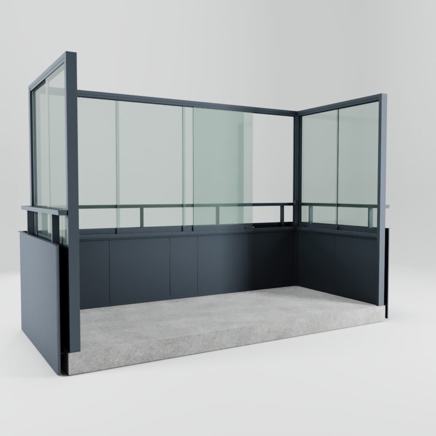 Bottenlöpande skjutsystem med flera spår. Skjutbara, ramlösa luckor som löper bakom varandra. Härdat glas 8–10 mm för ökad stabilitet. Monteras innanför befintligt balkongräcke