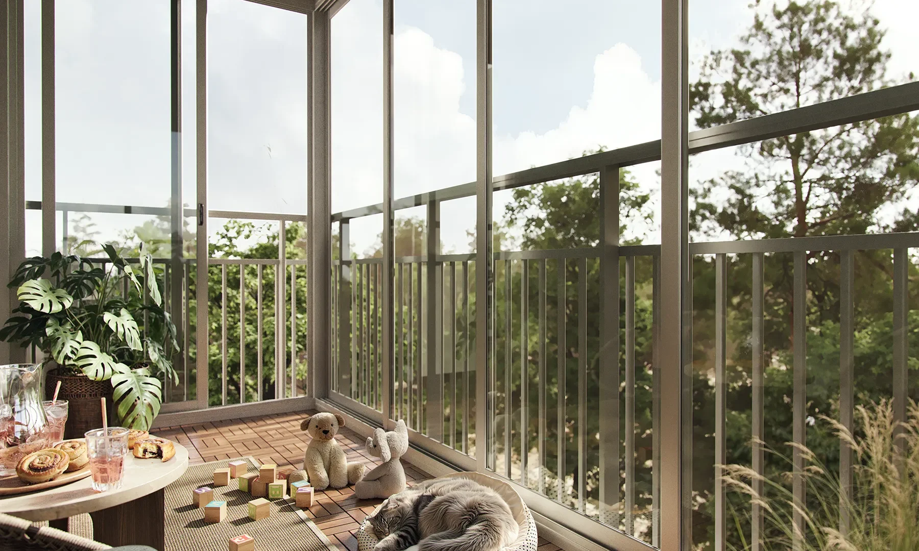 Windoor 450 med bred ram är en balkonginglasning med skjutsystem för dig som vill ha extra stabilitet, bättre täthet och en mer ombonad känsla på balkongen. De våningshöga glaspartierna löper smidigt bakom varandra och skapar ett skyddat, lugnt och lättmöblerat utrymme.